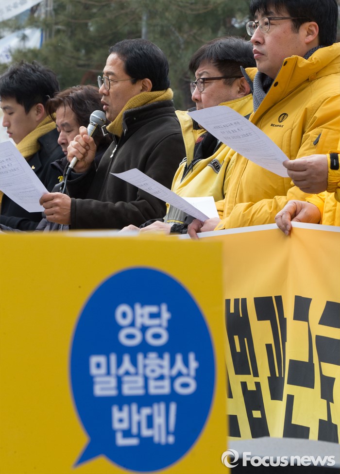 (대전=포커스뉴스) 26일 오전 대전 서구 대전지방고용노동청 앞에서 정의당 대전시당원들이 기자회견을 열고 쉬운해고 취업규칙 변경 및 정부지침 철회를 촉구하고 있다.