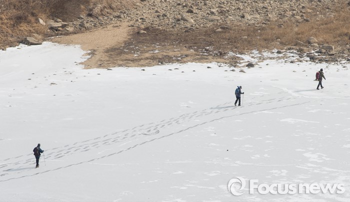 (철원=포커스뉴스) 26일 오전 강원 철원군 한탄강 일대에서 여행객들이 얼음트래킹을 즐기고 있다.