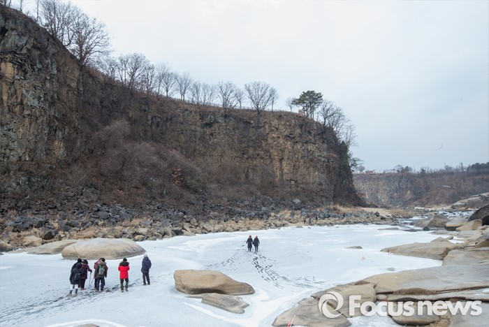 (철원=포커스뉴스) 26일 오전 강원 철원군 한탄강 일대에서 여행객들이 얼음트래킹을 즐기고 있다.