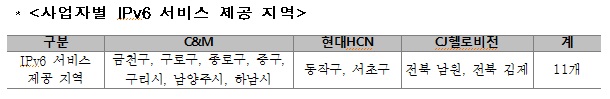 강성주 미래부 인터넷융합정책관은 “유선분야에서도 IPv6 확산을 가속화 할 수 있는 계기를 마련한 것으로 그간 추진한 무선망의 IPv6 상용화와 더불어 유무선망의 균형 있는 발전에 기여할 것”이라고 전망했다.무제한인터넷주소 서비스 제공 지역.<표제공=미래부>