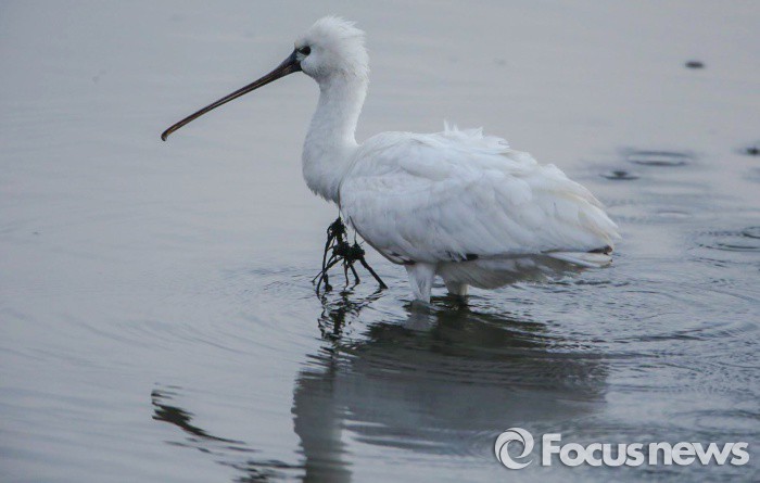 (서산=포커스뉴스) 26일 초천수만에서 월동중이던 겨울철새 노랑부리저어새(천연기념물 205호) 의 가슴에 철사줄이 엉켜있어 구조의 손길을 기다리고 있다. 서산 김신환동물병원장이 처음 발견한 이 노랑부리저어새는 이틀째 이런 상태로 혹시라도 이 철사줄이 더 좋이게 되면 생명이 위태한 지경이다. <사진제공=김신환원장>
