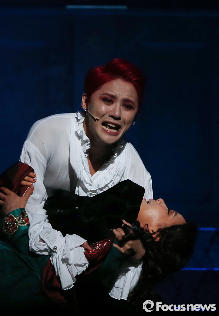 (서울=포커스뉴스) 26일 오후 서울 종로구 세종문화회관에서 열린 뮤지컬 '드라큘라' 프레스콜에 참석한 배우 김준수가 하이라이트 공연을 선보이고 있다.