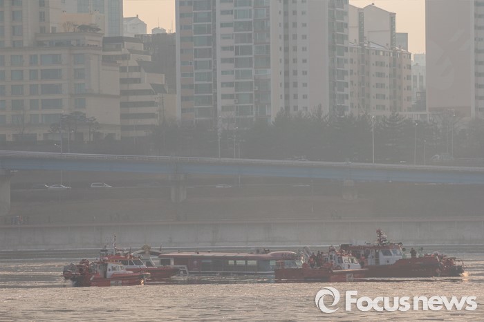 (서울=포커스뉴스) 26일 오후 서울 한강 영동대교 인근을 지나던 한강유람선이 침수, 구조대원들이 구조활동과 견인 작업을 하고 있다.