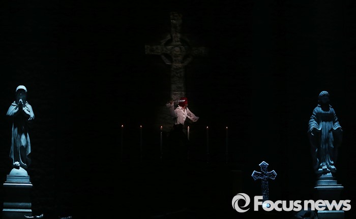 (서울=포커스뉴스) 26일 오후 서울 종로구 세종문화회관에서 열린 뮤지컬 '드라큘라' 프레스콜에 참석한 배우 김준수가 극중 연인을 잃은 드라큘라가 절망하는 장면을 선보이고 있다.