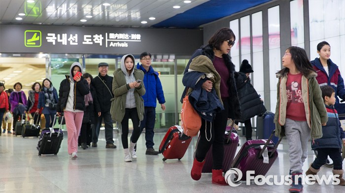 국토부 관계자는 당초 26일 오전 6시까지 24시간 운항을 허용했지만 아직 제주공항에 남은 체류객이 많아 운항 가능 시간을 추가로 연장했다고 설명했다.(서울=포커스뉴스) 폭설과 한파로 사흘째 운항이 중단됐던 제주공항에 갇혀있던 탑승객들이 25일 오후 서울 강서구 김포국제공항 국내선으로 입국하고 있다. 2016.01.25 김인철 기자
