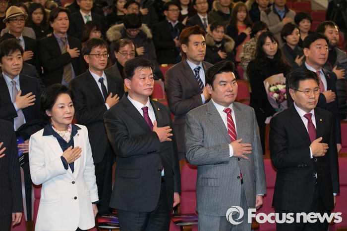 (서울=포커스뉴스) 26일 오후 서울 여의도 국회 의원회관에서 열린 15회 대한민국 국회대상 시상식에 참석한 홍문종(오른쪽부터) 새누리당 의원, 원유철 원내대표, 김명연, 류지영 의원 등 참석자들이 국기에 대한 경례를 하고 있다.