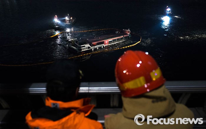 (서울=포커스뉴스) 26일 오후 서울 한강 영동대교 아래에서 한강유람선이 침수된 가운데 소방당국 관계자들이 사고현장을 살펴보고 있다.