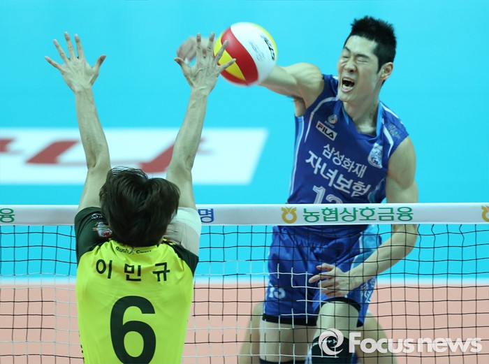 (안산=포커스뉴스) 26일 안산상록수체육관에서 열린 '2015-2016NH농협 V-리그' 남자부 OK저축은행-삼성화재 경기에서 삼성화재 최귀엽이 OK저축은행 이민규의 블로킹을 피해 스파이크를 때리고 있다.
