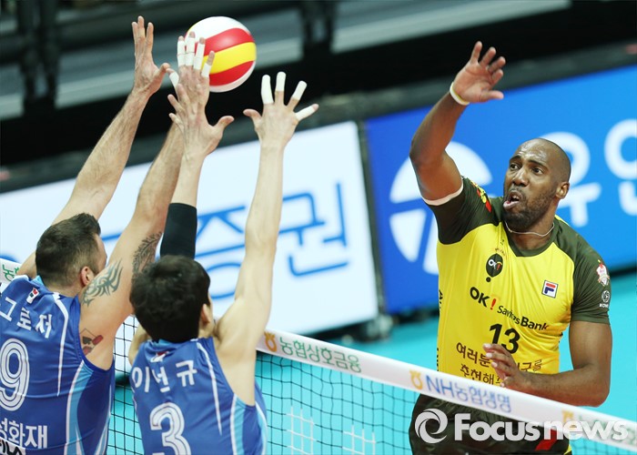 (안산=포커스뉴스) 26일 안산상록수체육관에서 열린 '2015-2016NH농협 V-리그' 남자부 OK저축은행-삼성화재 경기에서 OK저축은행 시몬이 삼성화재 그로저, 이선규의 블로킹을 향해 스파이크를 때리고 있다.