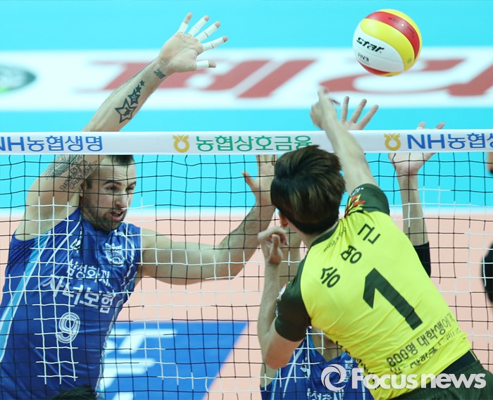 (안산=포커스뉴스) 26일 안산상록수체육관에서 열린 '2015-2016NH농협 V-리그' 남자부 OK저축은행-삼성화재 경기에서 삼성화재 그로저가 OK저축은행 송명근의 연타 공격에 블로킹을 대고 있다.