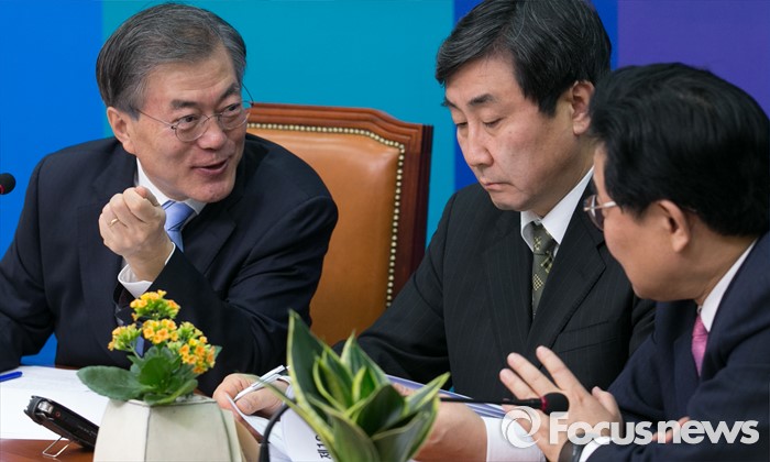 (서울=포커스뉴스) 문재인(왼쪽부터) 더불어민주당 대표가 27일 오전 서울 여의도 국회에서 열린 최고위원회의에 참석해 이종걸 원내대표, 전병헌 최고위원과 대화하고 있다.