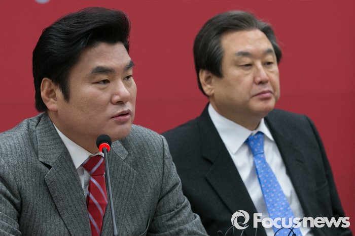 (서울=포커스뉴스) 원유철(왼쪽) 새누리당 원내대표가 27일 오전 서울 여의도 국회에서 열린 최고중진연석회의에 참석해 모두발언하는 동안 김무성 대표가 경청하고 있다.