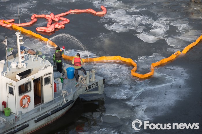 (서울=포커스뉴스) 27일 오전 서울 한강 영동대교 아래에서 침수된 한강유람선을 인양하기 위해 바지선을 정박, 관계 당국이 얼음을 녹이는 작업을 위해 염화칼슘을 살포하고 있다.