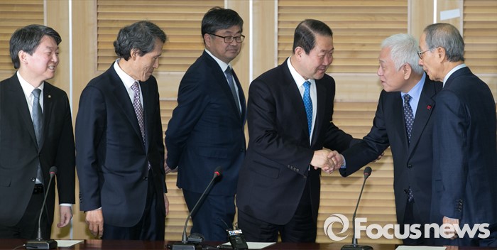 (서울=포커스뉴스) 27일 오전 서울 여의도 국회 의원회관에서 국민의당-통합신당 통합발표 기자회견을 마친 뒤 김한길 국민의당 상임부위원장과 박주선 통합신당 창당준비위원장이 악수하고 있다. 왼쪽부터 안철수 국민의당 인재영입위원장, 한상진 공동창당준비위원장, 최원식 대변인, 박 위원장, 김 상임부위원장, 윤여준 국민의당 공동창당준비위원장.