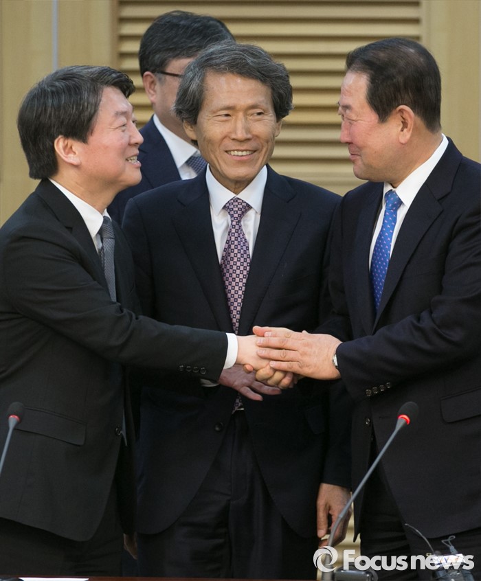 (서울=포커스뉴스) 27일 오전 서울 여의도 국회 의원회관에서 국민의당-통합신당 통합발표 기자회견을 마친 뒤 안철수(왼쪽) 국민의당 인재영입위원장과 박주선(오른쪽) 통합신당 창당준비위원장이 악수하고 있다. 가운데는 한상진 국민의당 공동창당준비위원장.