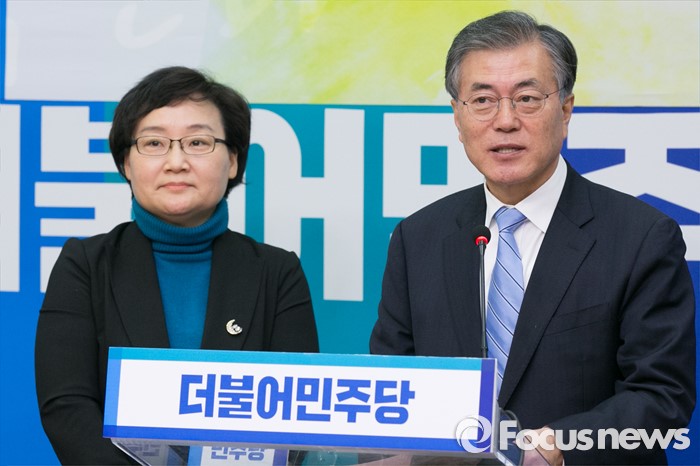 (서울=포커스뉴스) 문미옥(왼쪽) 한국여성과학기술인지원센터 기획정책실장이 27일 오전 서울 여의도 국회 더불어민주당 대표회의실에서 입당 기자회견을 마치고, 문재인 대표의 인사말을 경청하고 있다