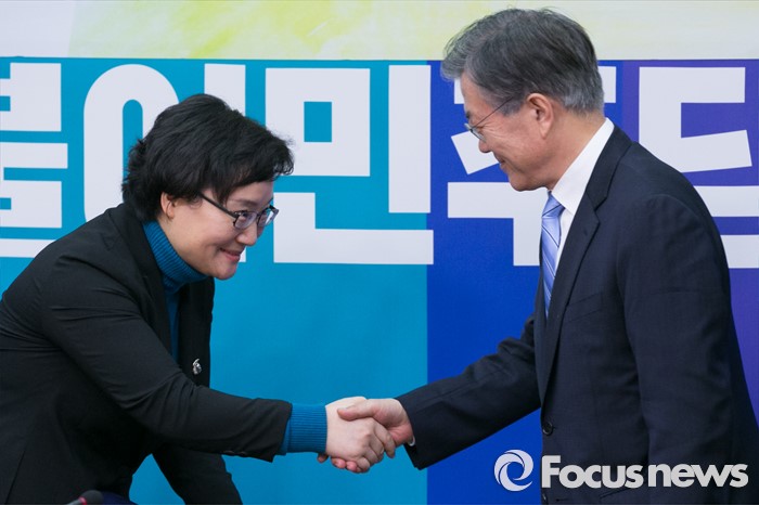 (서울=포커스뉴스) 문미옥(왼쪽) 한국여성과학기술인지원센터 기획정책실장이 27일 오전 서울 여의도 국회 더불어민주당 대표회의실에서 입당 기자회견을 마치고 문재인 대표와 악수하고 있다