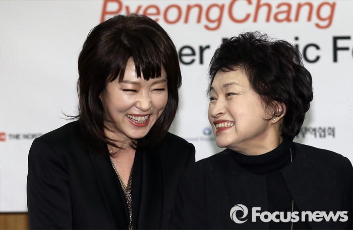 (서울=포커스뉴스) 27일 오전 서울 중구 엠버서더 호텔에서 열린 '2016 평창겨울음악제' 기자간담회에 참석한 음악감독 정경화(오른쪽)과 재즈보컬리스트 나윤선이 미소를 짓고 있다.