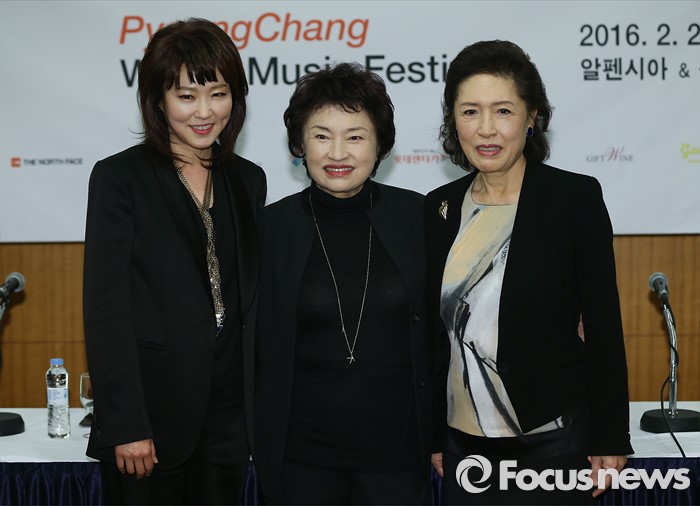 (서울=포커스뉴스) 27일 오전 서울 중구 엠버서더 호텔에서 열린 '2016 평창겨울음악제' 기자간담회에 참석한 재즈보컬리스트 나윤선(왼쪽부터), 음악감독 정경화, 정명화가 인사말을 하고 있다.