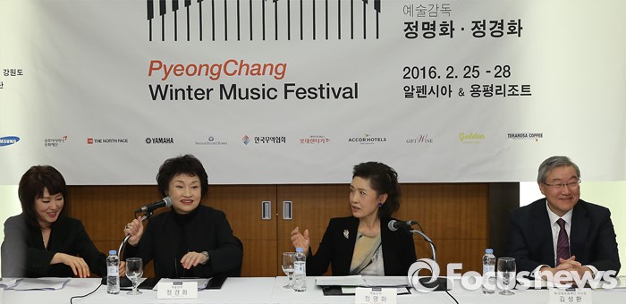 (서울=포커스뉴스) 27일 오전 서울 중구 엠버서더 호텔에서 열린 '2016 평창겨울음악제' 기자간담회에 참석한 정명화(왼쪽 세번째) 음악감독이 취재진의 질문에 답하고 있다. 왼쪽부터 재즈보컬리스트 나윤선, 음악감독 정경화, 정명화, 김성환 강원문화재단 이사장