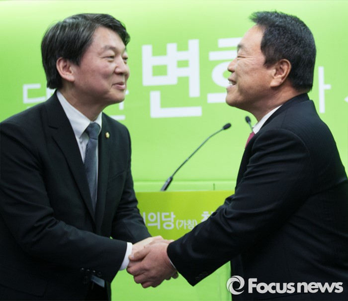 (서울=포커스뉴스) 국민의당 안철수 의원이 27일 오전 서울 마포구 국민의당 당사 기자회견장에서 이성수 전 대구시 의회 의장과 인사를 나누고 있다.