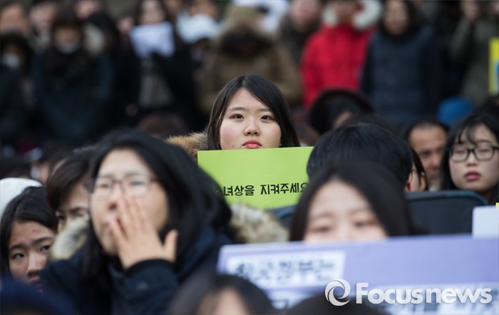 (서울=포커스뉴스) 27일 오후 서울 종로구 구 일본대사관 앞에서 열린 제 1215차 일본군 위안부 문제 해결을 위한 정기수요집회에 참석한 학생들이 피켓을 들고 있다.