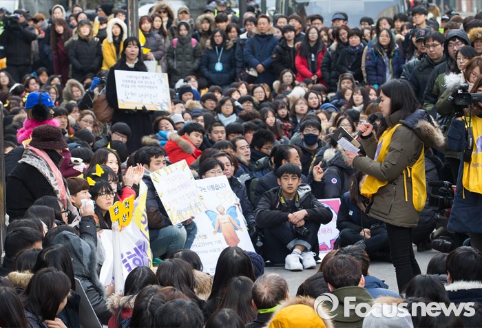 (서울=포커스뉴스) 27일 오후 서울 종로구 구 일본대사관 앞에서 열린 제 1215차 일본군 위안부 문제 해결을 위한 정기 정기수요시위에 참석한 이용수 할머니가 학생들과 함께 집회를 하고 있다.