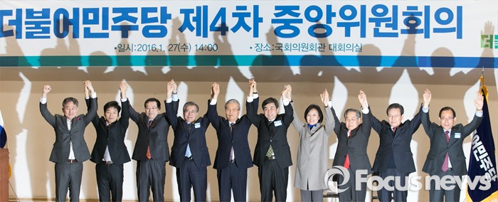 (서울=포커스뉴스) 27일 오후 서울 여의도 국회에서 열린 더불어민주당 중앙위원회의에 참석한 문재인 대표와 김종인 선거대책위원장 겸 비대위원장 등 위원들이 취재진을 향해 포즈를 취하고 있다. 왼쪽부터 표창원, 김병관, 이용섭 비대위원, 문 대표, 김 위원장, 이종걸 원내대표, 박영선, 우윤근, 변재일 비대위원, 김성곤 중앙위의장.