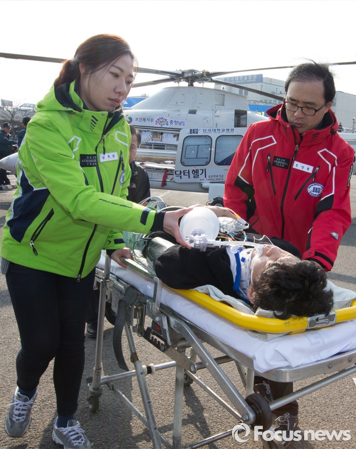 (천안=포커스뉴스) 27일 오후 충남 천안시 단국대학교병원에서 열린 충청남도 응급의료 전용헬기(닥터헬기) 출범식에서 의료진들이 가상 환자이송훈련을 하고 있다.