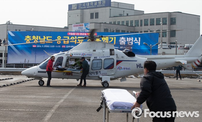(천안=포커스뉴스) 27일 오후 충남 천안시 단국대학교병원에서 열린 충청남도 응급의료 전용헬기(닥터헬기) 출범식에서 의료진들이 가상 환자이송훈련을 하고 있다.