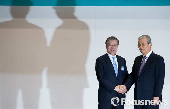 (서울=포커스뉴스) 27일 오후 서울 여의도 국회에서 열린 더불어민주당 중앙위원회의에 참석한 문재인(왼쪽) 대표와 김종인 선거대책위원장 겸 비대위원장이 취재진을 향해 포즈를취하고 있다.