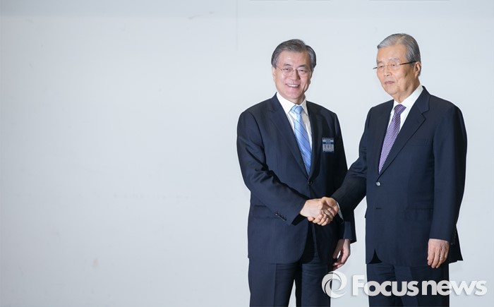 (서울=포커스뉴스) 27일 오후 서울 여의도 국회에서 열린 더불어민주당 중앙위원회의에 참석한 문재인(왼쪽) 대표와 김종인 선거대책위원장 겸 비대위원장이 취재진을 향해 포즈를취하고 있다.