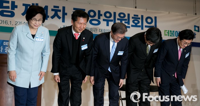 (서울=포커스뉴스) 27일 오후 서울 여의도 국회에서 열린 더불어민주당 중앙위원회의에 참석한 문재인 대표 등 지도부가 참석자들을 향해 인사하고 있다. 왼쪽부터 유승희, 정청래 최고위원, 문 대표, 이종걸 원내대표, 전병헌 최고위원.