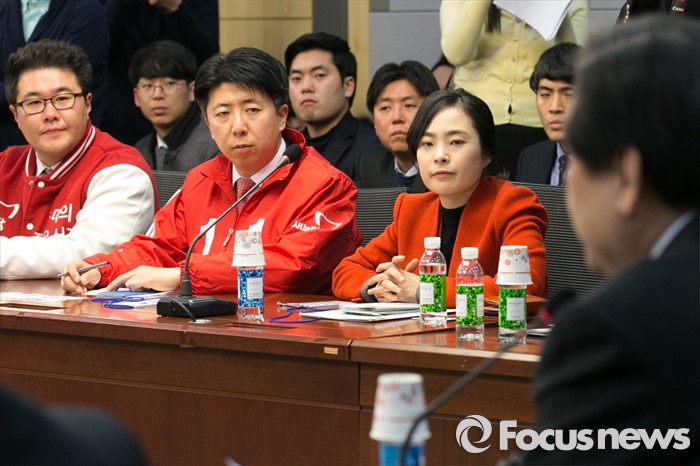 (서울=포커스뉴스) 김무성(오른쪽 뒷모습) 새누리당 대표가 27일 오후 서울 여의도 국회 의원회관에서 열린 청년 공천 설명회에 참석해 인사말을 하는 동안 손수조(오른쪽 두번째) 예비후보를 비롯한 참석자들이 경청하고 있다.