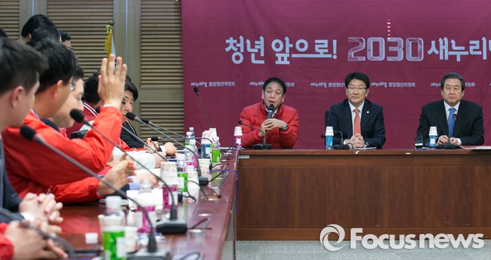 (서울=포커스뉴스) 김무성(오른쪽) 새누리당 대표를 비롯한 당 지도부가 27일 오후 서울 여의도 국회 의원회관에서 열린 청년 공천 설명회에 참석해, 청년 예비후보들의 발언을 경청하고 있다.