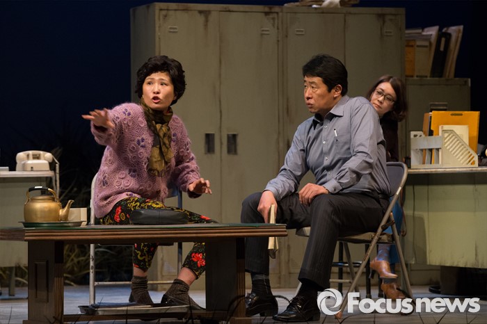 (서울=포커스뉴스) 27일 오전 서울 중구 명동예술극장에서 열린 연극 '날 보러와요' 프레스콜에 배우 황석정(남씨부인)와 이대연(김반장)이 연기하고 있다.