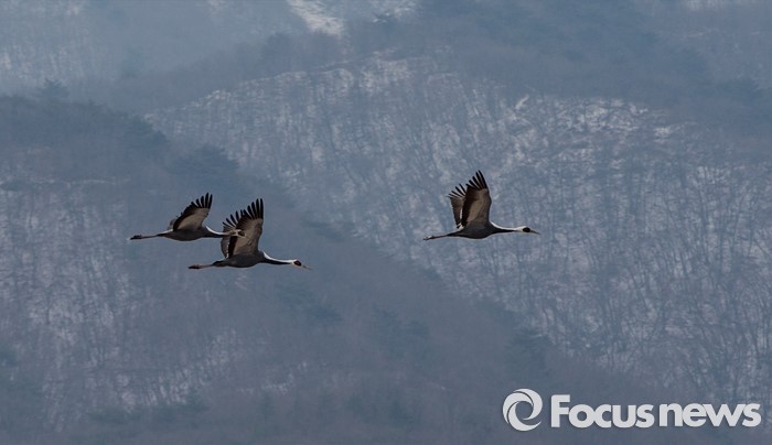(철원=포커스뉴스) 겨울 진객 재두루미가 26일 강원 철원군 인근에서 무리 지어 날고 있다.