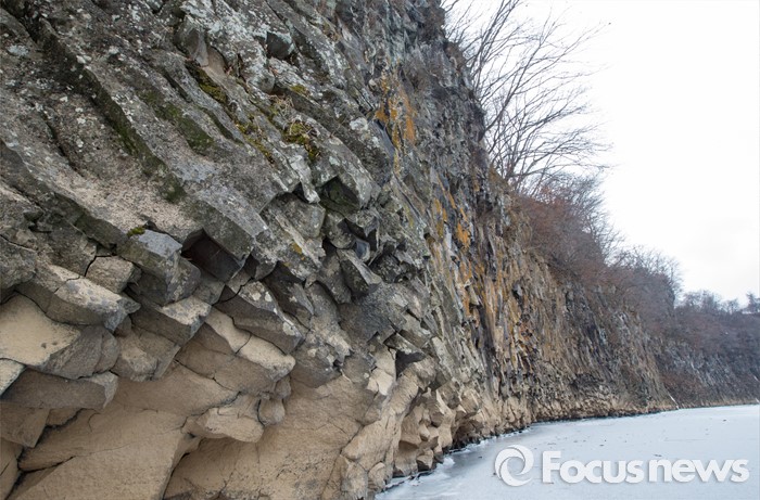 (철원=포커스뉴스) 26일 강원 철원군 현무암 협곡 주상절리 아래로 한탄강이 얼어붙어 있다.