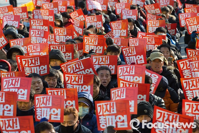 (서울=포커스뉴스) 27일 오후 서울 종로구 세종로 소공원에서 열린 '민주노총 총파업 수도권대회'에 참가한 민주노총 조합원들이 정부의 노동법 개정 중단을 촉구하는 구호를 외치고 있다.