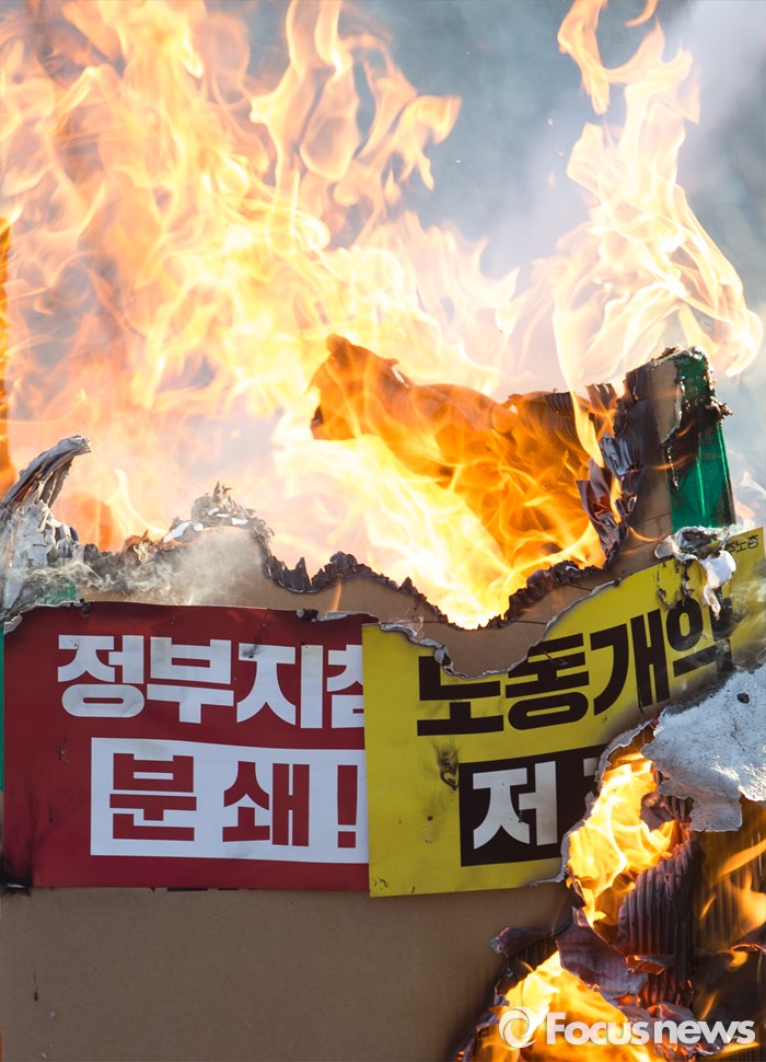 | △ 불 타는 '노동탄압' 상징물 |