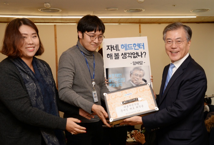 (서울=포커스뉴스) 문재인 더불어민주당 대표가 27일 서울 여의도 한 음식점에서 열린 당직자와의 오찬 간담회에 참석해 당직자들로부터 금화 모양 초콜릿 퇴직금을 선물받고 있다. <사진제공=더불어민주당>