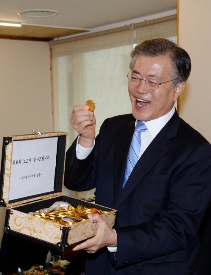 (서울=포커스뉴스) 문재인 더불어민주당 대표가 27일 서울 여의도 한 음식점에서 열린 당직자와의 오찬 간담회에 참석해 당직자들로부터 금화 모양 초콜릿 퇴직금을 선물받고 있다. <사진제공=더불어민주당>