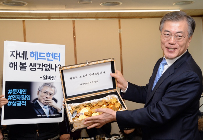 (서울=포커스뉴스) 문재인 더불어민주당 대표가 27일 서울 여의도 한 음식점에서 열린 당직자와의 오찬 간담회에 참석해 당직자들로부터 금화 모양 초콜릿 퇴직금을 선물받고 있다. <사진제공=더불어민주당>