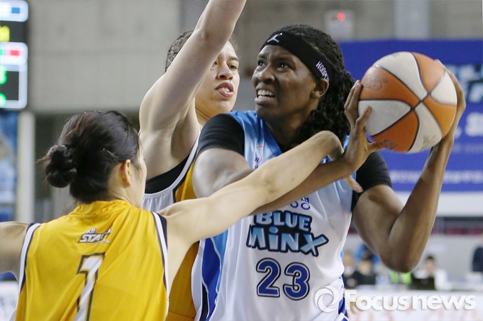 (용인=포커스뉴스) 27일 용인실내체육관에서 열린 2015-2016 여자프로농구 삼성생명-KB스타즈 경기에서 KB스타즈 햄비와 홍아란이 삼성생명 해리스를 앞뒤에서 밀착수비하고 있다.