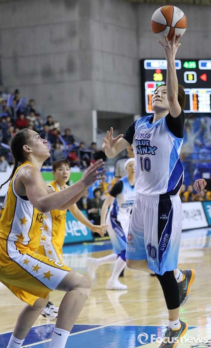 (용인=포커스뉴스) 27일 용인실내체육관에서 열린 2015-2016 여자프로농구 삼성생명-KB스타즈 경기에서 삼성생명 고아라가 KB스타즈 햄비를 앞에 두고 레이업슛을 시도하고 있다.