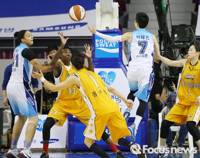 (용인=포커스뉴스) 27일 용인실내체육관에서 열린 2015-2016 여자프로농구 삼성생명-KB스타즈 경기에서 골밑 돌파를 시도하던 삼성생명 박태은이 스톡스에게 패스하고 있다.