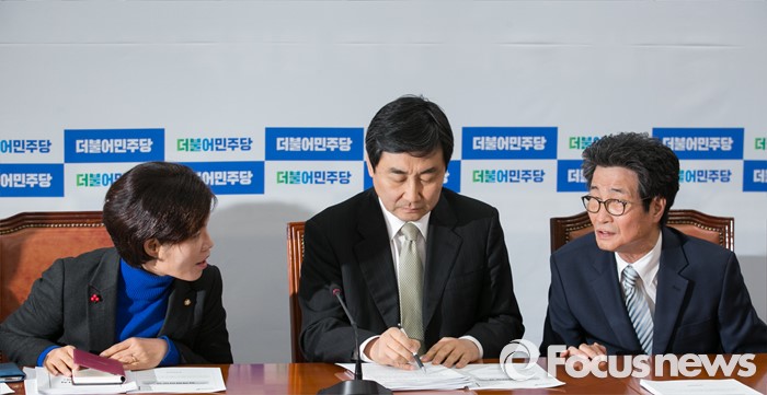 (서울=포커스뉴스) 이종걸(가운데) 더불어민주당 원내대표와 이목희(오른쪽) 정책위의장, 한정애 원내부대표가 28일 오전 서울 여의도 국회에서 열린 정책조정회의에 참석해 대화하고 있다.