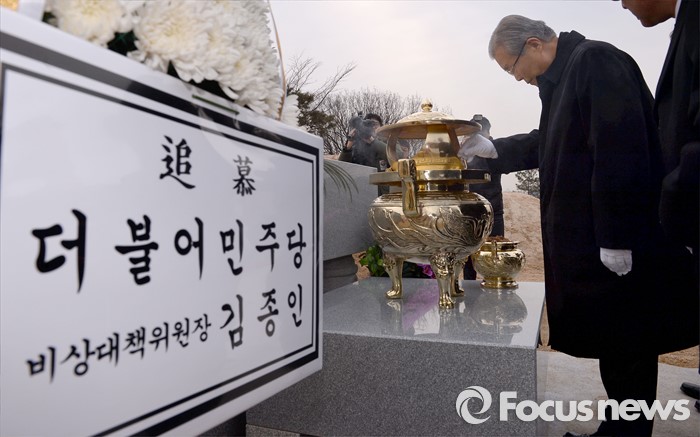 (서울=포커스뉴스) 28일 오전 서울 동작구 국립서울현충원에서 김종인 선거대책위원장 겸 비대위원장이 김영삼 전 대통령 묘역 참배를 하고 있다.
