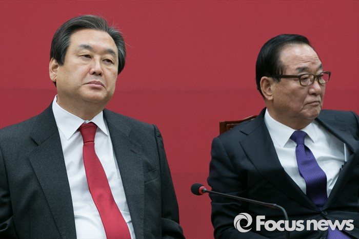 (서울=포커스뉴스) 김무성(왼쪽) 새누리당 대표와 서청원 최고위원이 28일 오전 서울 여의도 국회에서 열린 최고위원회의에 참석해, 어색한 표정으로 앉아 있다. 이 자리에서 서 최고위원은 김 대표를 향해 “김무성 대표가 권력자 발언을 해서 왜 이런 이야기를 해서 분란을 일으키느냐”고 정면 비판했다.