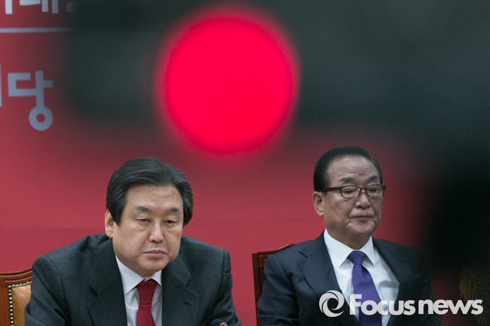 (서울=포커스뉴스) 김무성(왼쪽) 새누리당 대표와 서청원 최고위원이 28일 오전 서울 여의도 국회에서 열린 최고위원회의에 참석해, 어색한 표정으로 앉아 있다. 이 자리에서 서 최고위원은 김 대표를 향해 “김무성 대표가 권력자 발언을 해서 왜 이런 이야기를 해서 분란을 일으키느냐”고 정면 비판했다.